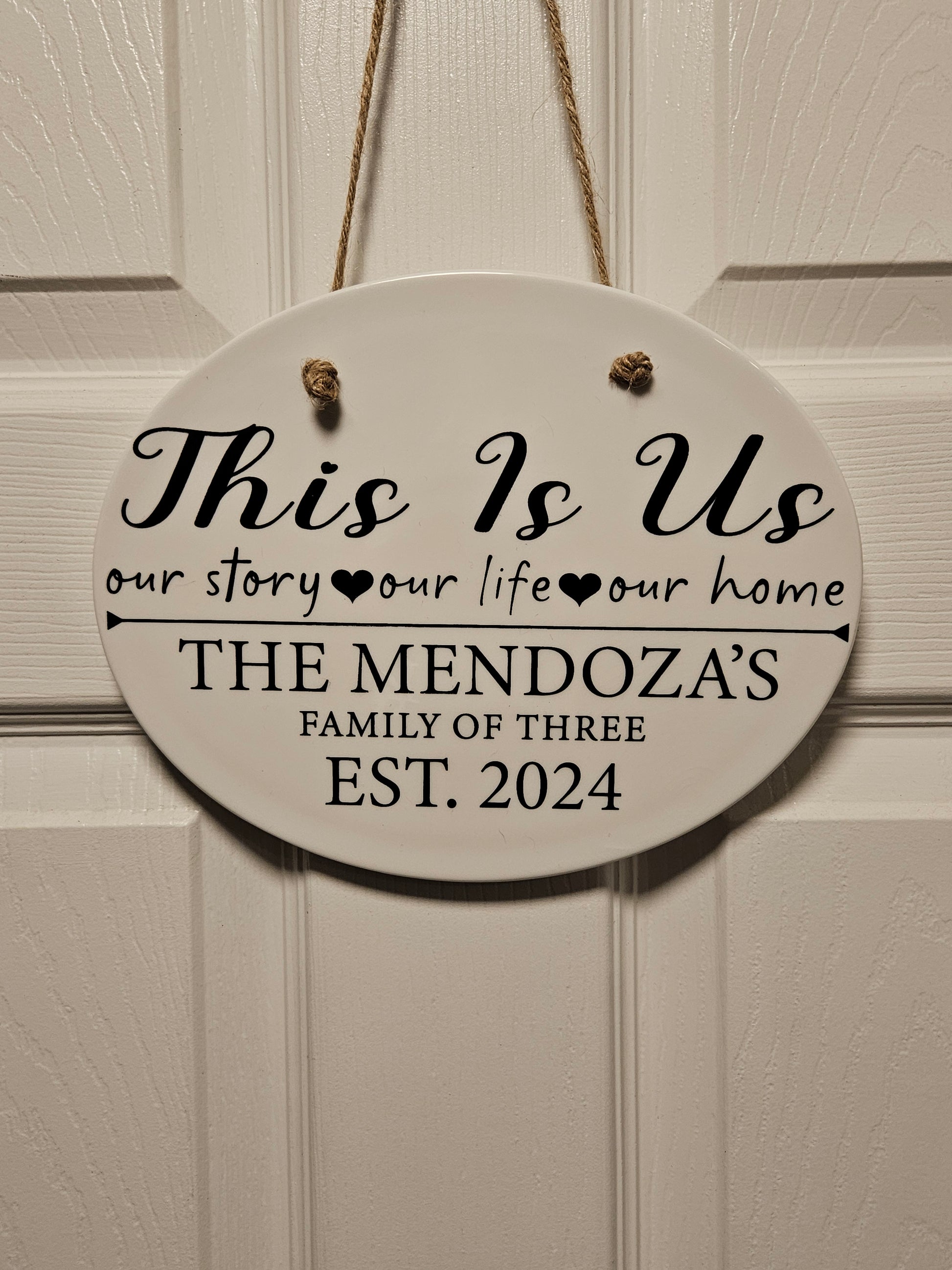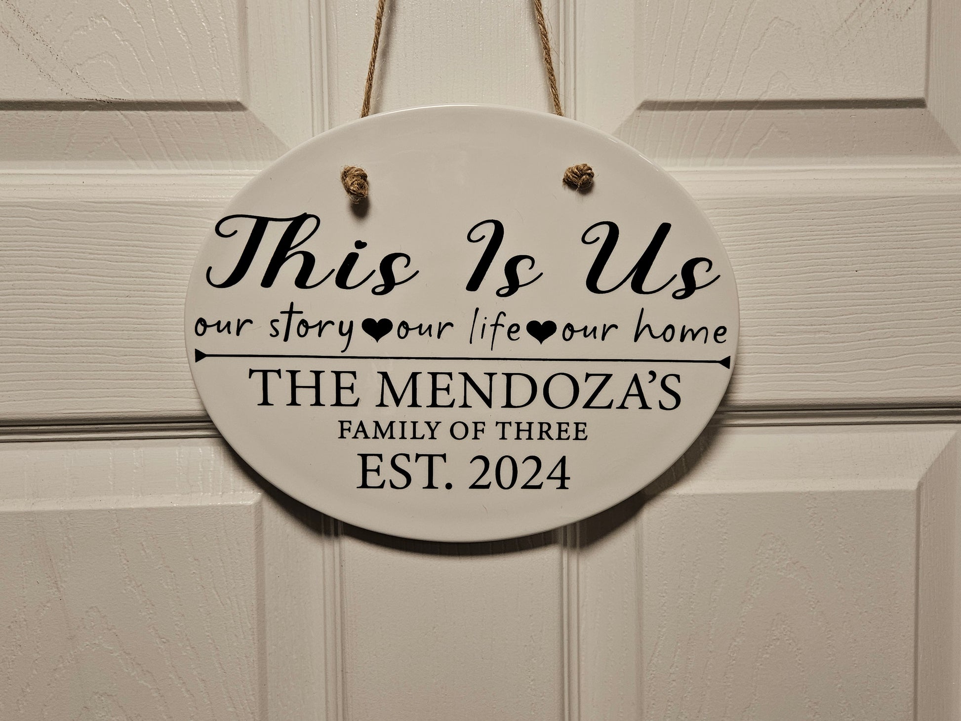 This hanging oval ceramic sign is perfect for adding a touch of personalization to your home. Use it to display your address, family name, or personalized messages. Size is 10"x5"